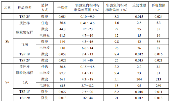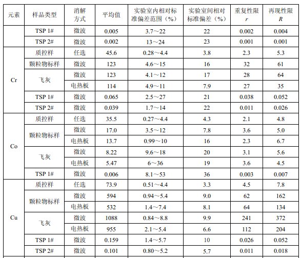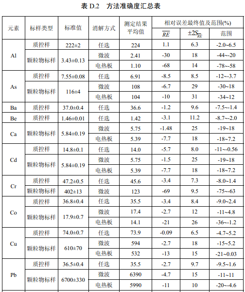 7家實驗室分別對統(tǒng)一提供的大氣顆粒物標(biāo)樣、濾膜質(zhì)控樣品、飛灰樣品(廢氣顆粒物模擬樣品)和2 個顆粒物負載量不同的TSP 樣品,同時取6 份平行樣品分別進行微波消解 (7.2.1.1 )和電熱板消解(7.2.1.2 ),用等離子體發(fā)射光譜法測量。對測定結(jié)果進行數(shù)理統(tǒng) 計,得到方法的精密度(各元素測定值的實驗室內(nèi)標(biāo)準(zhǔn)偏差范圍、實驗室間標(biāo)準(zhǔn)偏差、重復(fù) 性限和再現(xiàn)性限)和方法的準(zhǔn)確度(各元素測定值的相對誤差范圍和相對誤差最終值),詳 見附錄D。