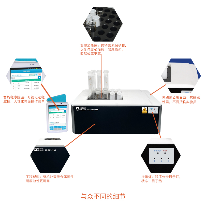 DS-360-25H高溫石墨消解儀具有無線控制技術實現(xiàn)遠程操作實驗、時刻掌握動態(tài)。無線的設計讓操作者遠離酸霧,避免對人體直接接觸,保障人員安全。高溫石墨消解儀儀器采用高純石墨作為加熱體,包裹式加熱,石墨材質可以讓溫度更均勻,效率更高。多孔的設計,輕松實現(xiàn)了批量的處理樣品,節(jié)省了大量的時間,提高工作效率,是您實驗室樣品前處理消解的好伙伴。