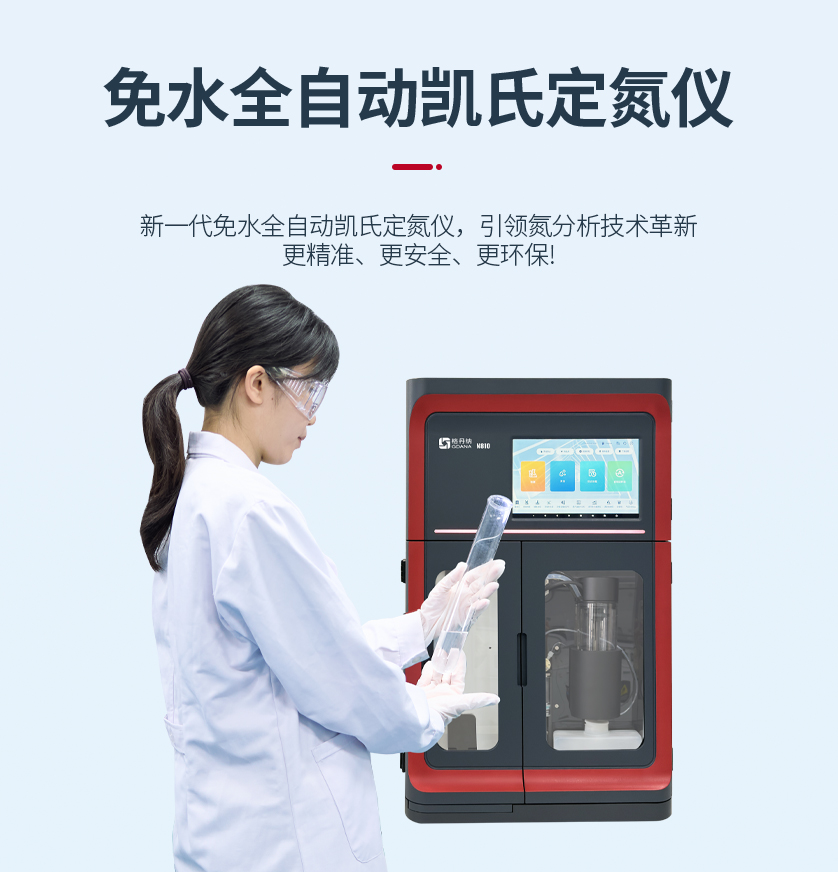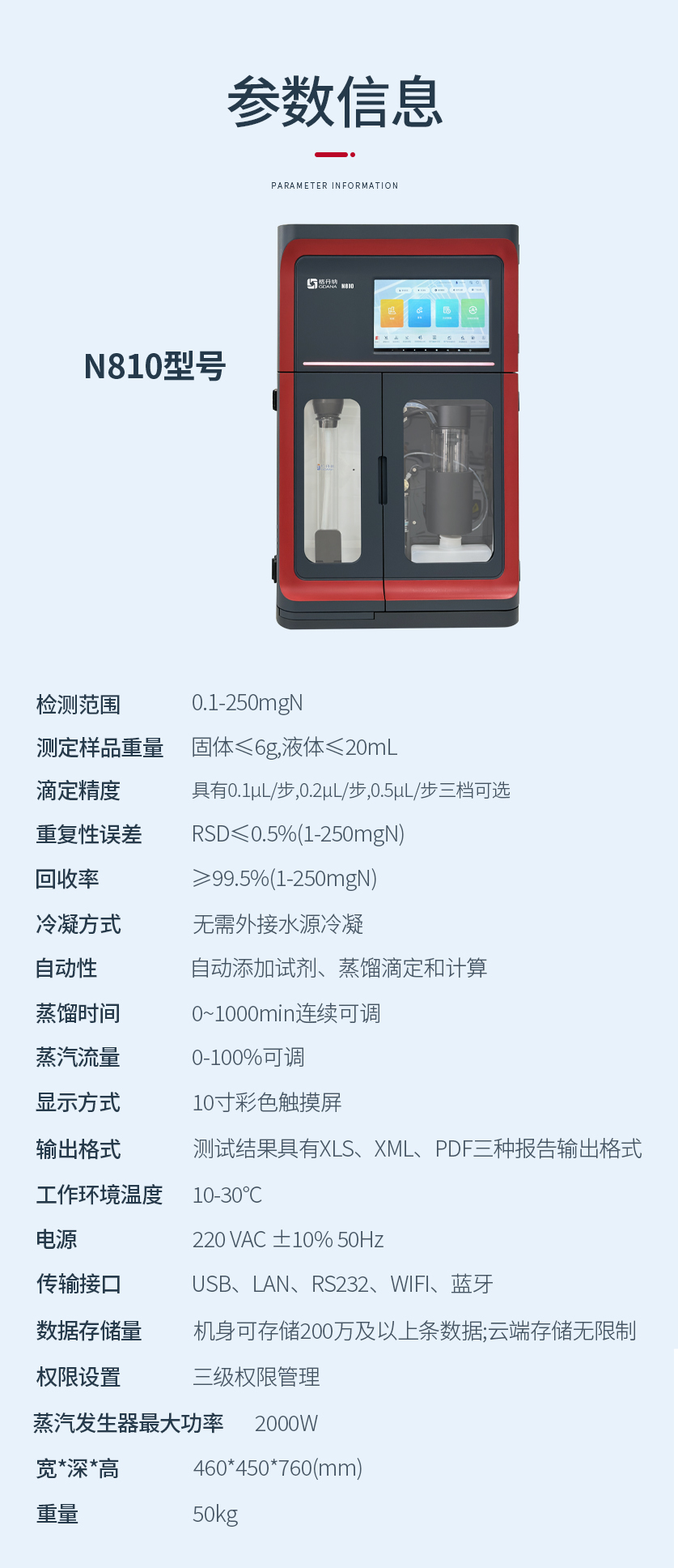 新一代N810免水全自動凱氏定氮儀,突破了傳統凱氏定氮儀依賴外接水源或冷水機冷凝的局限,搭載免水冷卻系統,既提升了實驗的準確度與效率,更增強了儀器運行的可靠性。這一創新設計,大幅節省了外接冷卻水循環機的采購成本與日常水資源開支。儀器集成免水冷凝、自動加堿加酸、加注稀釋劑、蒸餾滴定、消化管排空、溶液液位監測、超溫預警、清洗排廢、結果智能計算等全流程功能,實現凱氏定氮實驗的無人值守式操作。儀器采用符合國家標準的凱氏定氮方法:濃硫酸環境消解樣品、堿性環境蒸汽蒸餾、硼酸吸收、加指示劑滴定、終點顏色判定法。