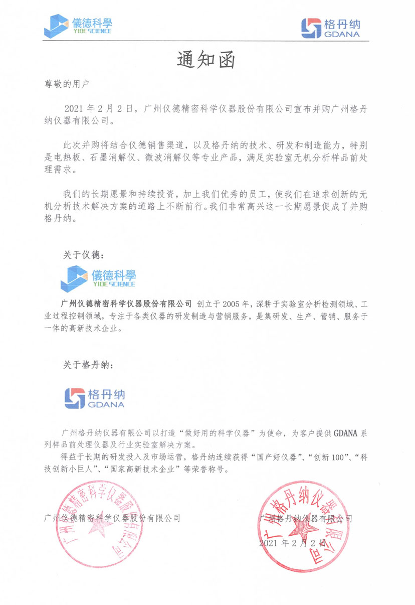 為進(jìn)一步促進(jìn)企業(yè)的發(fā)展,推動公司并購重組工作,茲廣州儀德精密科學(xué)儀器股份有限公司于2021年2月2日正式并購廣州格丹納儀器有限公司,特此聲明。