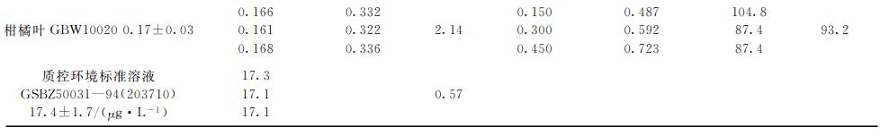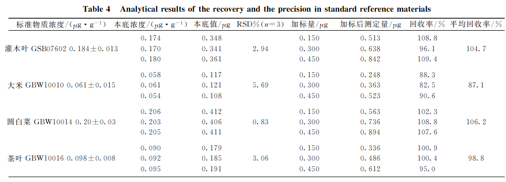 分別選取灌木葉、大米、圓白菜、茶葉和柑橘葉五種植物標準樣品,每種重復3次準確稱取2.0g(精確至0.0001g),按上述實驗條件進行消解,測定本底值。再對每種植物標樣稱取子樣,每種重復3次準確稱取2.0g(精確至0.0001g),此次每種試樣中分別加入1.0mg?L-1硒標準溶液150,300,450gL,進行消解并測定加標后值,同時測定硒質控環境標準溶液(GSBZ50031-94(203710)),結果見表4??梢?硒標準加標回收率在87.1%~106.2%之間,精密度(n=3)在0.83%~5.69%之間,所測結果均與標準物質的參考值吻合,完全達到分析要求。