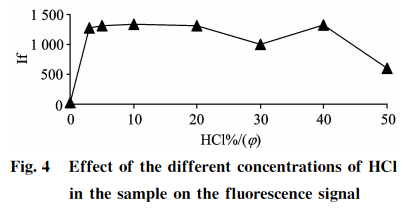 品消化過程的酸度確保了Se+還原成Se+,上機測試前樣品經稀釋后制備液酸度也會影響硒的測定結果。分別吸取100gg?L-標準應用液5.0mL于7個50mL的具塞比色管中,分別加入0.0,1.5,2.5,5.0,10.0,15.0,20.025,0mL濃HCl,用純水稀釋定容至刻度,用以制備不同酸度的10gg?L硒標準溶液,以2.4中的載流和還原劑濃度進行上機測定,結果見圖4??芍?扣除空白后,HCl(g)在3%~20%范圍內,10gg?L-1硒標準溶液具有較強且穩定的熒光強度;當樣品HCl(q)>20%時,硒熒光值受到抑制且不穩定,考慮到樣品酸度的提高有利于硒的還原,同時可以減少共存元素的干擾,故本方法選用15%HCl(g)酸度作為樣品和標準溶液上機測試時制備液的酸度,才能保證測量的穩定性和一致性。