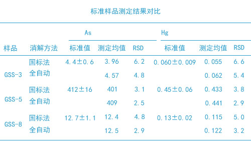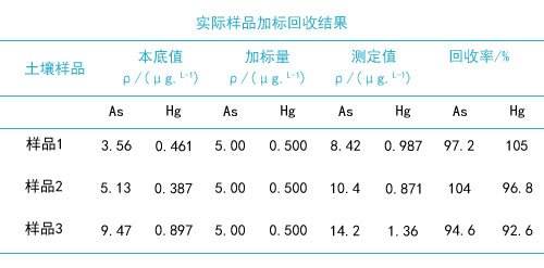 對3份實際土壤樣品加標,結果見下表。由表中可知,全自動石墨消解法處理樣品,砷和汞的加標回收率分別為94.6%~104%和92.6%~105%。試驗說明,該方法測定土壤中的砷和汞,準確度和精密度均能滿足質量控制的要求。