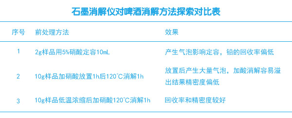 采用智能石墨消解儀低溫加熱揮發啤酒中的乙醇,加硝酸消解,結合原子吸收檢測,建立了啤酒中鉛的測定方法結果相當滿意。此方法簡單、實用、靈敏,完善了相關標準中啤酒中鉛檢測的前處理方法,適用于啤酒高通量鉛的準確檢測。智能石墨消解儀在實驗中批量處理相當快速,無線遠程程序控溫,包裹式加熱處理更加消解完全。