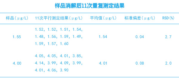 分別對濃度為1.55μg/L的固廢樣品和濃度為4.00μg/L的標(biāo)準(zhǔn)樣品消解后進(jìn)行重復(fù)測定11次,測定結(jié)果見表1。