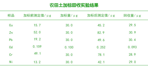 同時對農(nóng)田土進行加標(biāo)實驗,平行加標(biāo)3份,加標(biāo)回收率進行測定,結(jié)果如下表。
