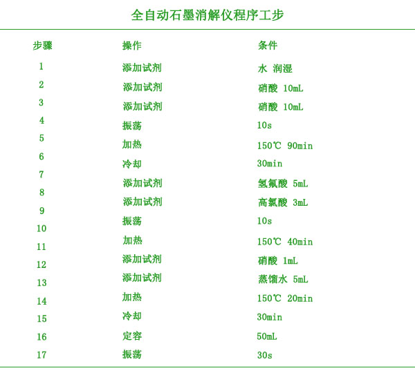 準(zhǔn)確稱取0.5g(精確至0.0001g)試樣于全自動石墨消解儀特氟龍消解管內(nèi),并置放到全自動消解儀石墨孔中,進行編號。用少量水潤濕后,加入硝酸和鹽酸各10mL,振搖10s,在150℃溫度下加熱90min;冷卻30min后,加入5mL氫氟酸和3mL高氯酸,振搖10s,在150℃溫度下加熱40min;再加入1mL硝酸和5mL蒸餾水,在150℃溫度下繼續(xù)加熱20min;冷卻30min,用蒸餾水定容至50mL,振搖30s。全自動石墨消解儀程序消解步驟如下: