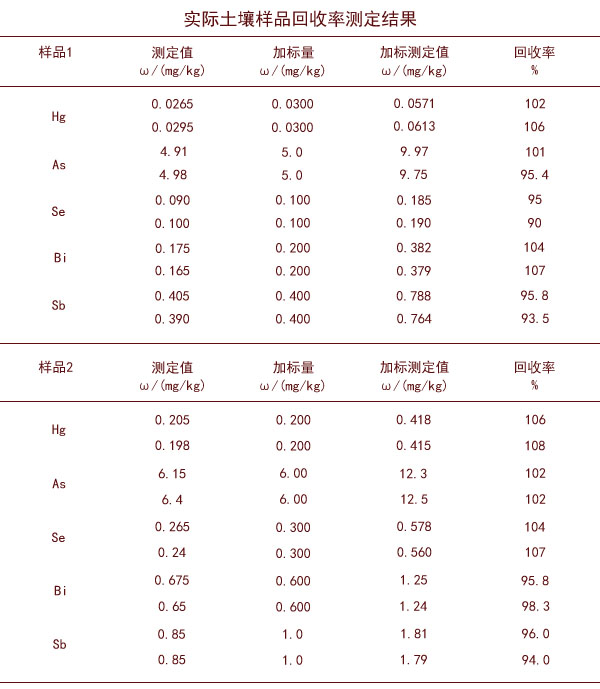 由表(實際土壤樣品消解測定回收率結果)可見,加標回收率均在90%~110%,結果符合相關要求。