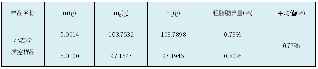 本次實(shí)驗(yàn)測得小麥粉質(zhì)控樣品中的粗脂肪含量為0.77%,符合該質(zhì)控樣品粗脂肪特性值要求(0.6~1.0%)。